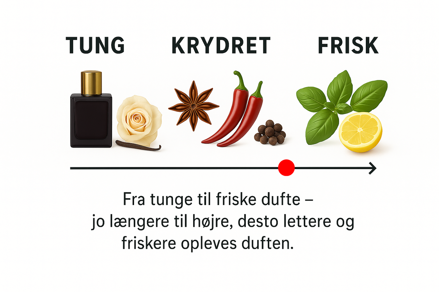 Vi anbefaler, at du læser vores duftbeskrivelser og kigger på duftfamilier (tung woody, frisk citrus, elegant flower osv.). Er du i tvivl, hjælper vi dig gerne med personlig rådgivning.